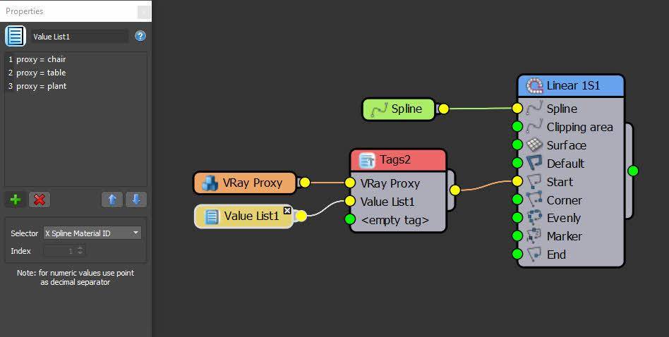 - Se utiliza un nuevo nodo de parámetros llamado Lista de valores para almacenar una lista de valores que se pueden seleccionar mediante un índice o un atributo de la ranura o el marcador. Es similar al operador Selector existente, excepto que se puede usar para cadenas, números, rangos de valores ('1-3') y listas de números/rangos separados por comas ('1-3,5,7').
