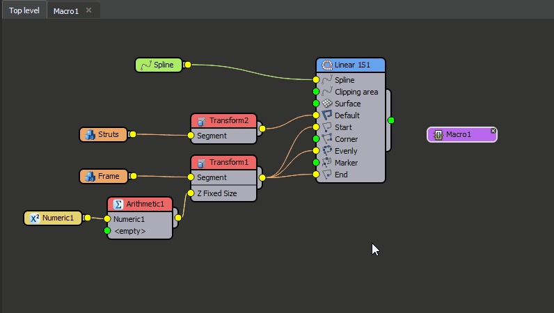 Cree macros fácilmente simplemente copiando y pegando un gráfico completo en una pestaña de macros. Todos los objetos base se convierten automáticamente en entradas y los nodos numéricos en parámetros. Ahora también está disponible un nuevo elemento de la interfaz de usuario del selector de combinaciones, y ahora puede organizar los parámetros agrupándolos en categorías para que sean más fáciles de entender. Por último, puede editar una macro con un simple clic doble en lugar de tener que abrirla mediante el menú del botón derecho.