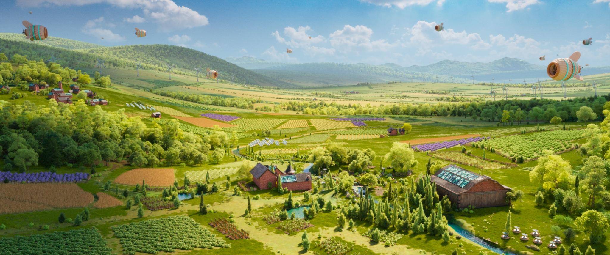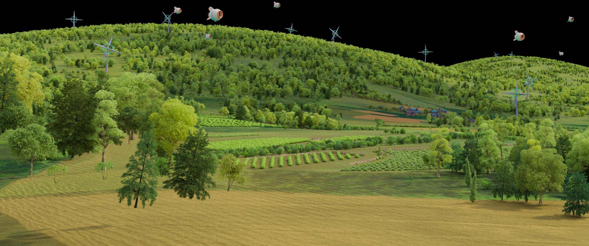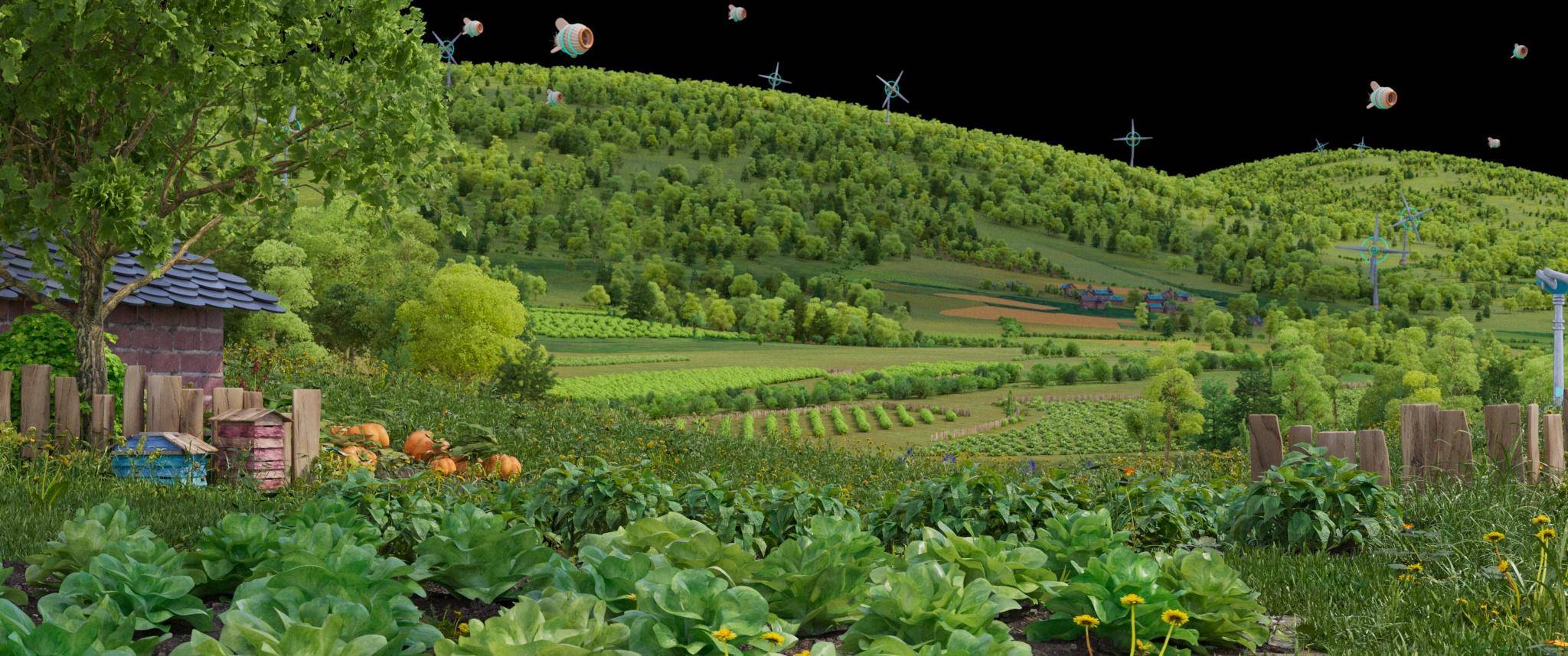 Cuatro de nosotros nos centramos en el arte ambiental y creamos seis localizaciones principales: la granja, la ribera, la ciudad, el interior de una tubería, las alcantarillas y el laboratorio, en un total de treinta y cuatro tomas. Utilizamos ForestPack de forma extensiva para los exteriores del campo, dispersando bosques, campos y césped, además de elementos como casas, turbinas eólicas, grava y puntales. Para los biomas, nos inspiramos en la campiña francesa y combinamos extensos bosques naturales con campos cultivados para crear paisajes orgánicos pero moldeados cuidadosamente por la presencia humana, un equilibrio que captura la estética solarpunk.