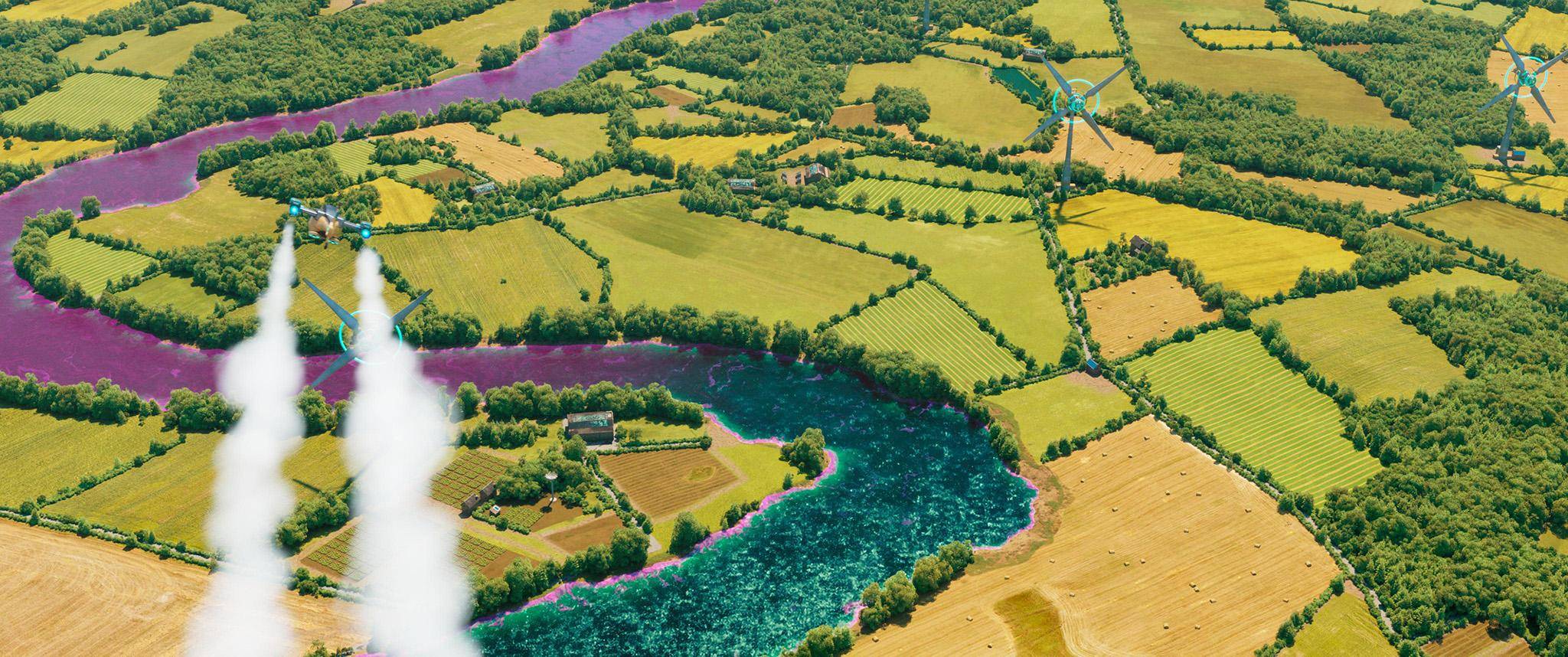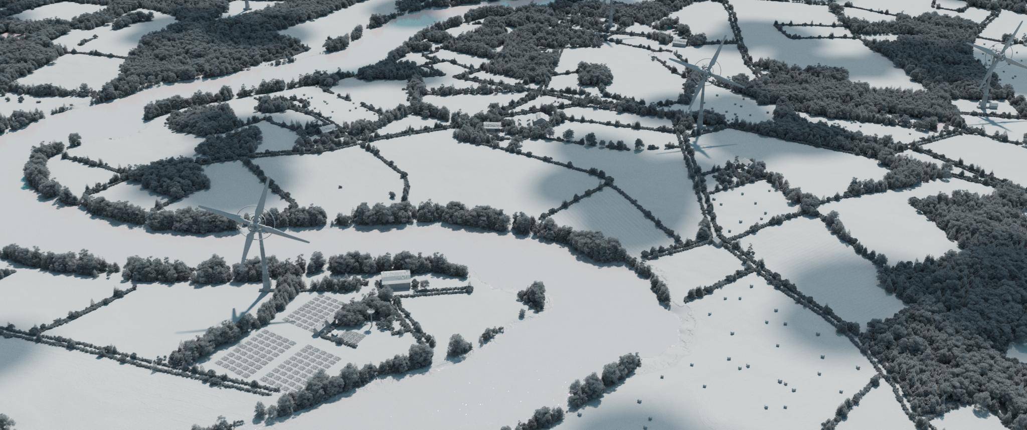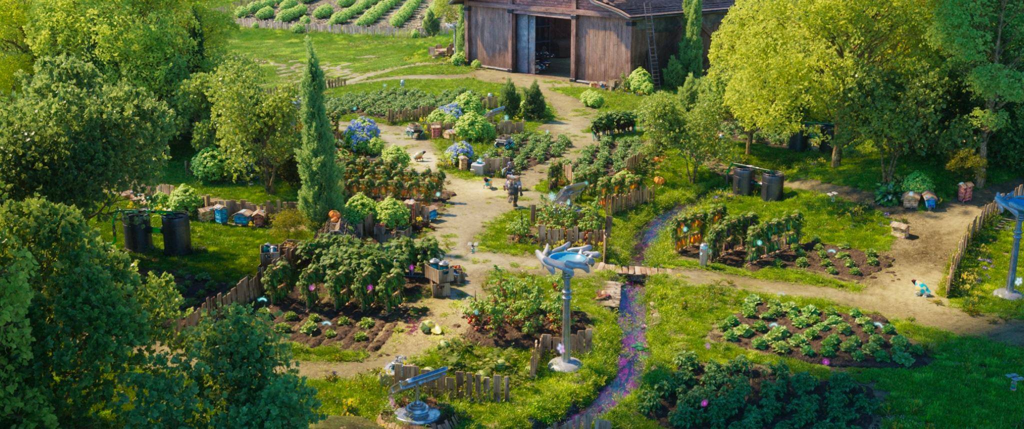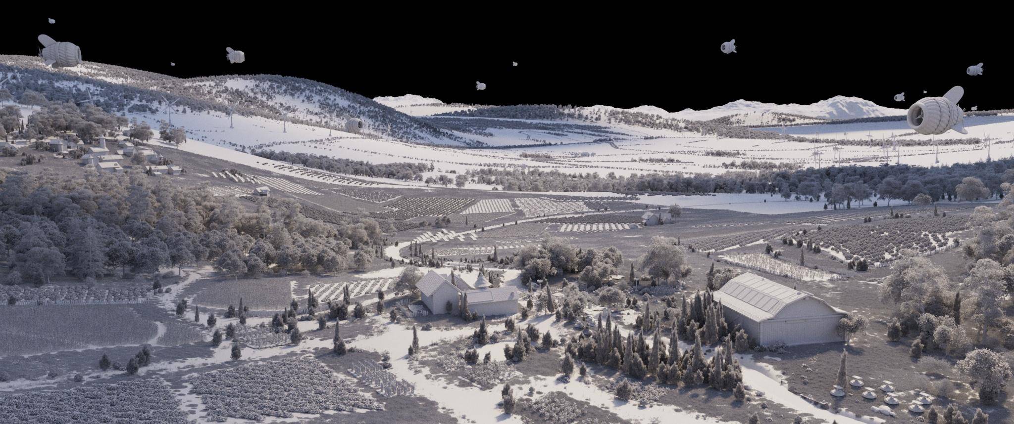 Cuatro de nosotros nos centramos en el arte ambiental y creamos seis localizaciones principales: la granja, la ribera, la ciudad, el interior de una tubería, las alcantarillas y el laboratorio, en un total de treinta y cuatro tomas. Utilizamos ForestPack de forma extensiva para los exteriores del campo, dispersando bosques, campos y césped, además de elementos como casas, turbinas eólicas, grava y puntales. Para los biomas, nos inspiramos en la campiña francesa y combinamos extensos bosques naturales con campos cultivados para crear paisajes orgánicos pero moldeados cuidadosamente por la presencia humana, un equilibrio que captura la estética solarpunk.