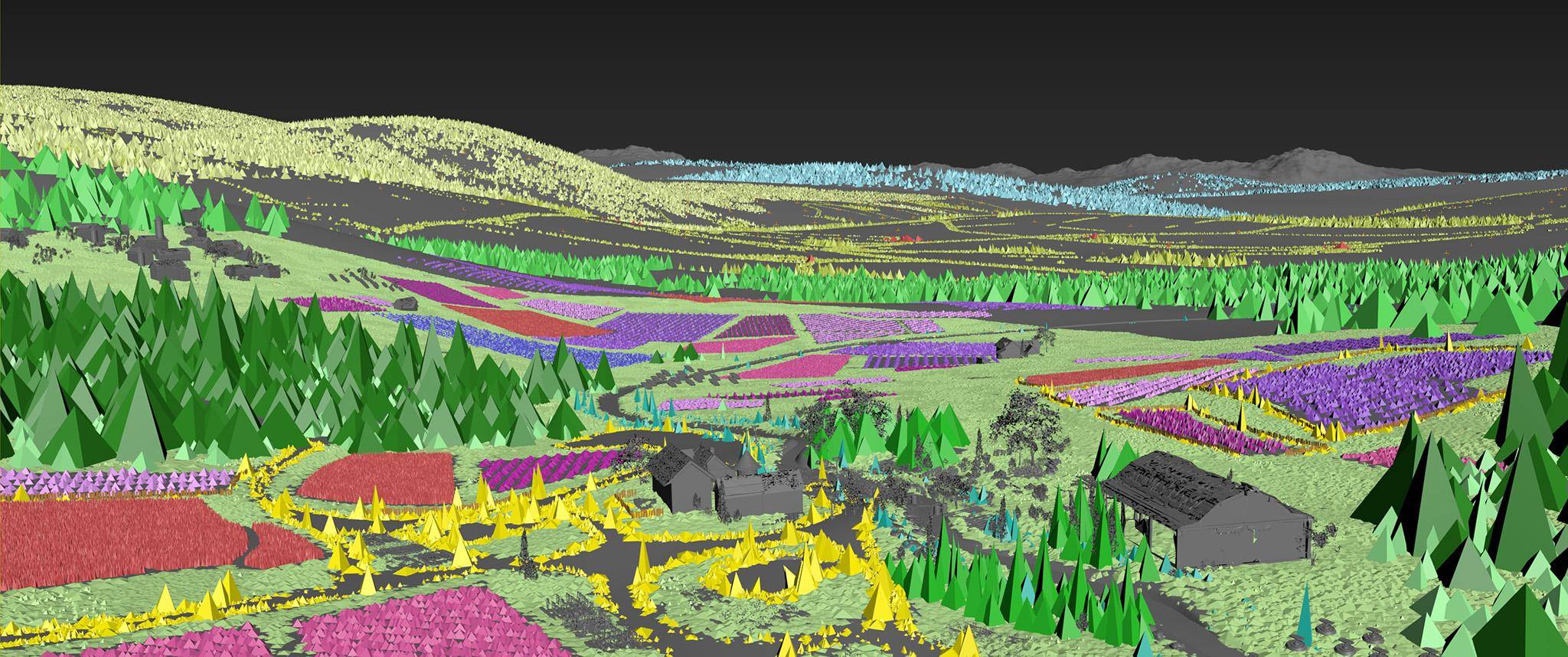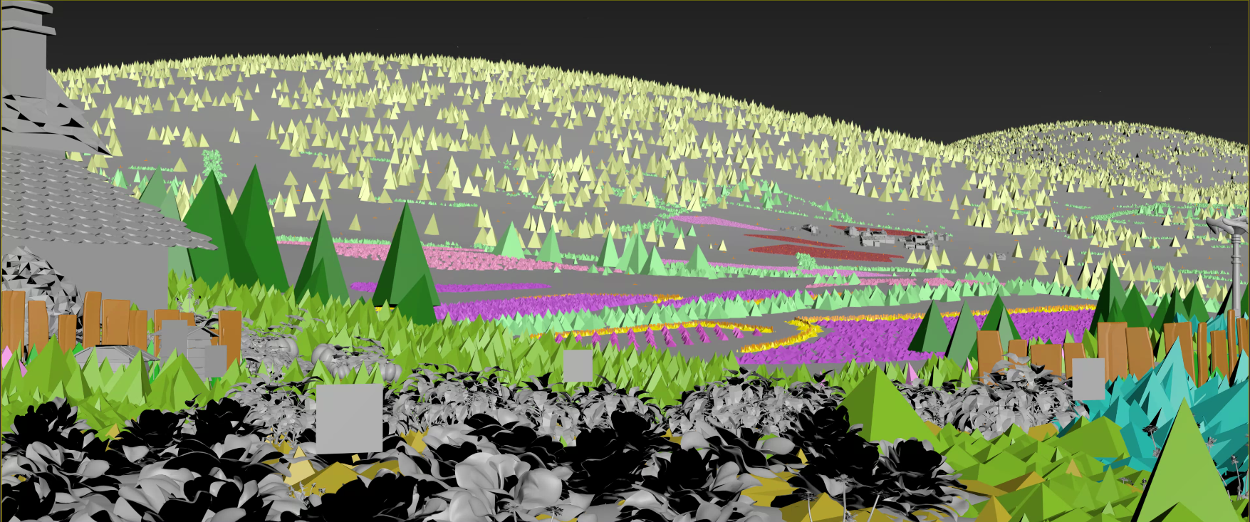 Para optimizar el rendimiento y hacer que la escena fuera manejable, se distribuyeron parcelas de césped más grandes en configuraciones simplificadas, reservándose distribuciones más detalladas para poder ver más de cerca la granja. Cada objeto  ForestPack estaba codificado por colores en la ventana gráfica, lo que facilitaba la identificación de diferentes capas, como cultivos, grupos de árboles o detalles arquitectónicos.