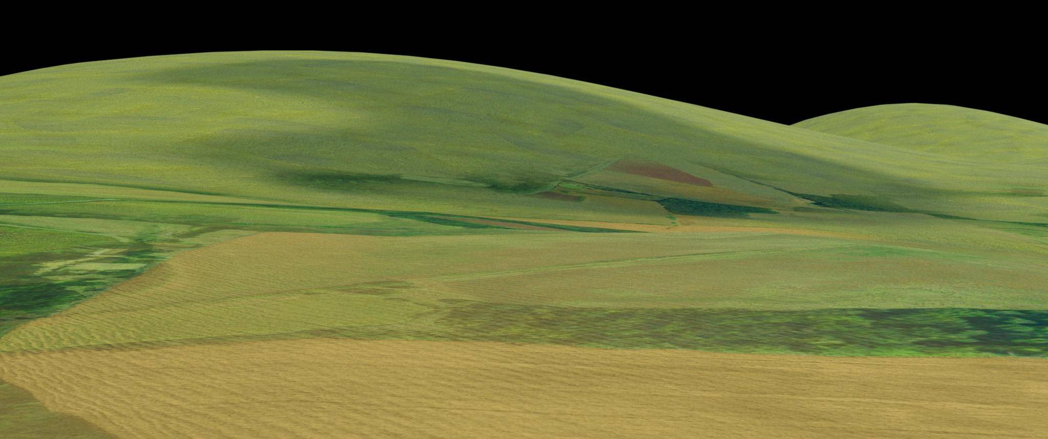 Como toque final, usé las mismas splines de la cerca para esparcir el césped y las flores más altas alrededor de la base, lo que ayudó a integrarlos en el entorno. Se usó exactamente el mismo método para colocar otros elementos repetitivos, como las hileras de turbinas eólicas en las laderas de las colinas.