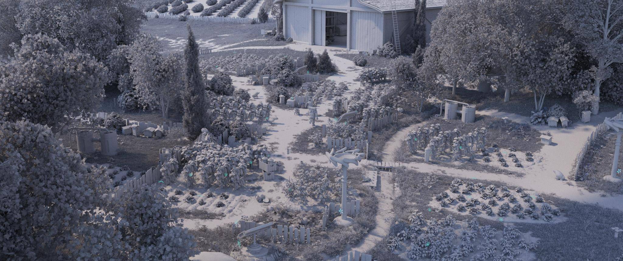 Esta zona, compuesta por grandes paisajes, planos medios y primeros planos, supuso todo un reto. Se extiende a doce planos. Éstos son algunos de ellos y algunos tutoriales sobre cómo se usó ForestPack para crearlos.