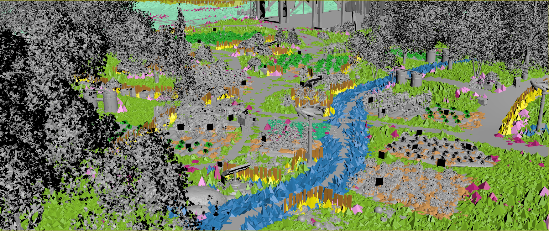 Eva Pringault fue responsable del entorno agrícola, Arthur Pezi de Riverside y Mehdi Kaouane de la ciudad. Cada uno de nosotros usó ForestPack de diferentes maneras, pero con métodos compartidos que nos ayudaron a mantener un aspecto final uniforme.