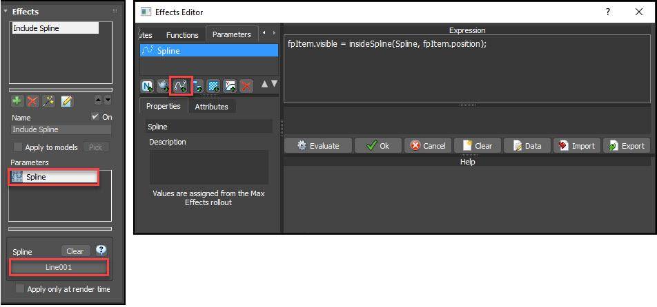 Les entrées Spline sont ajoutées à l'aide des déploiements de paramètres de l'éditeur d'effets. Plusieurs nouvelles fonctions prennent en charge le nouvel objet, qui fonctionnent toutes en 2D à l'aide du plan local XY :