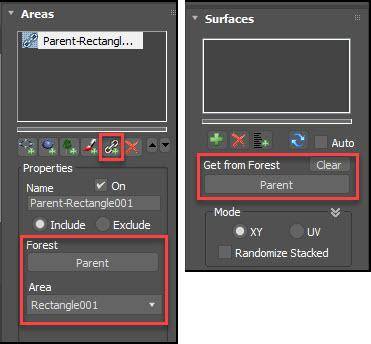 Pour étendre davantage les options de création de dispersions interdépendantes, Forest Pack 8 ajoute la possibilité de créer des liens vers des zones et des surfaces utilisées dans un autre objet Forest Pack.