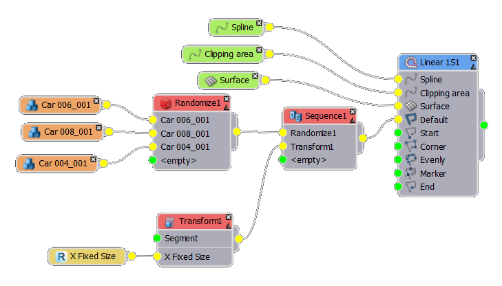 - Let’s ease the congestion by adding a randomly sized gap between each car. To do that, add a Sequence operator, wire the random node to its first input and wire a new Transform node to its second input. You can use a Transform node to stand in for a segment if you don’t plan to use any actual geometry.