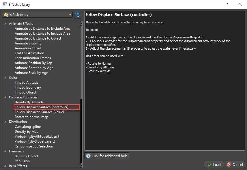 - Locate and the effect called Follow Displace Surface (controller). It’s in the Displaced Surface group. Click Load.