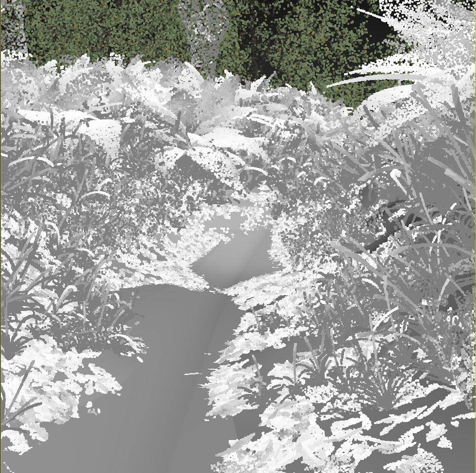 But here’s what happens when we render, because the terrain has been displaced up to a maximum of 10cm above the original position the bottom of the grasses and the clover are being buried, and the leaves have been completely covered!