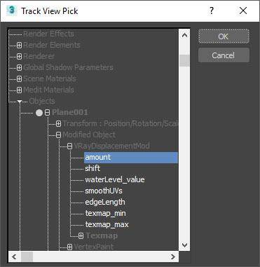 - To control the amount of displacement, we link the Forest Object directly to the VRayDisplacementMod Modifier. That way if you update the modifier, Forest Pack will be automatically adjusted too. To do this, click on the DisplacementAmount parameter and then click Pick Controller. From the Track Selector, find the terrain object and locate the Amount parameter of the VRayDisplacementMod modifier. Click OK.